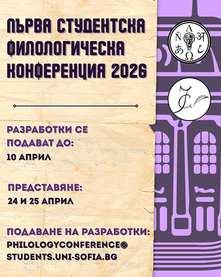 Факултетните студентски съвети към Факултета по класически и нови филологии и Факултета по славянски филологии отправят покана към всички студенти филолози в страната, бакалаври и магистри, да се включат в първата студентска филологическа конференция на Софийския университет „Св. Климент Охридски”